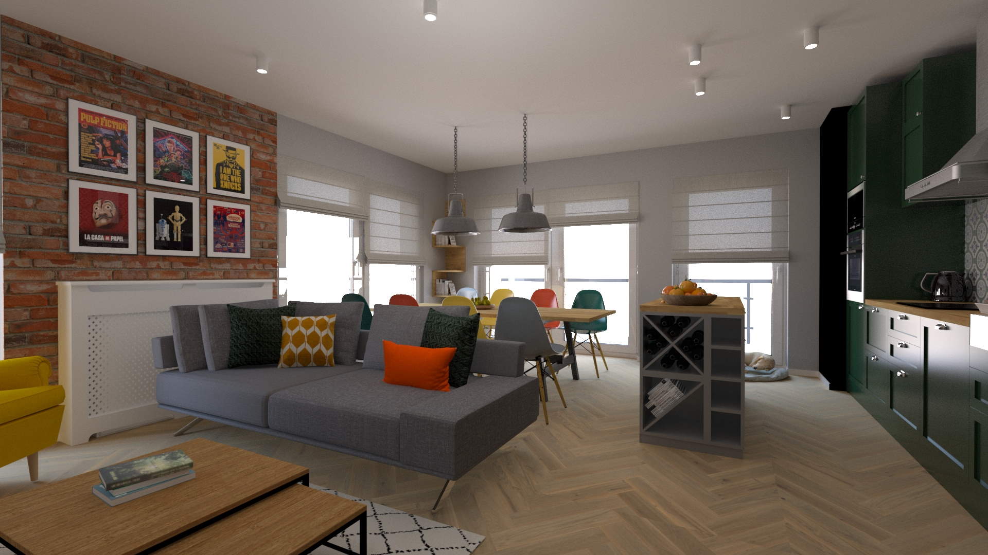 Projekt 90 metrowego apartamentu w Katowicach powstał dla bardzo szalonej i pozytywnej pary, która kocha kolory. Założeniem projektowym była aranżacja salonu wraz z kuchnią, garderoby, pomieszczenia gospodarczego, toalety, łazienki, sypialni, wiatrołapu oraz holu. Od początku wiedzieliśmy, że w projekcie pojawi się cegła i kolorowe krzesła. Zielona kuchnia stała się marzeniem, a granatowe łazienki z płytkami w stylu METRO nadają charakteru. Drewniana podłoga w jodełkę francuską podkreśliła klimat mieszkania.