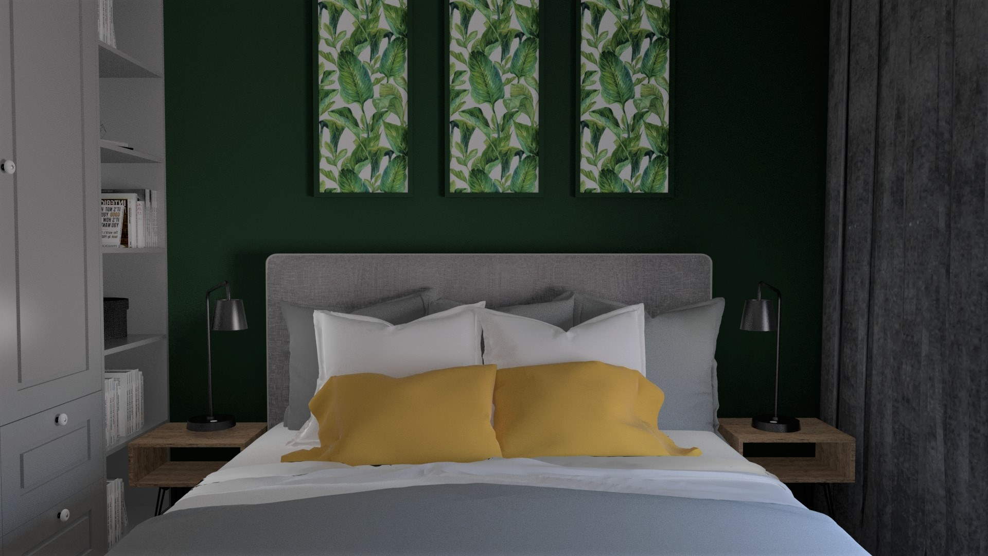 Sypialnia kolorem nawiązuje do zielonej kuchni. Ścianę za łóżkiem zdobią ramki wykonane z sztukaterii, gdzie środek został pokryty tapetą w liście. Szafę zaprojektowałam pod wymiar, z szarymi stylizowanymi frontami. Z jednej strony są otwarte półki, aby dodać lekkości całej zabudowie. W pokoju znajduje się również industrialna konsola, nad którą zawisły dekoracje.