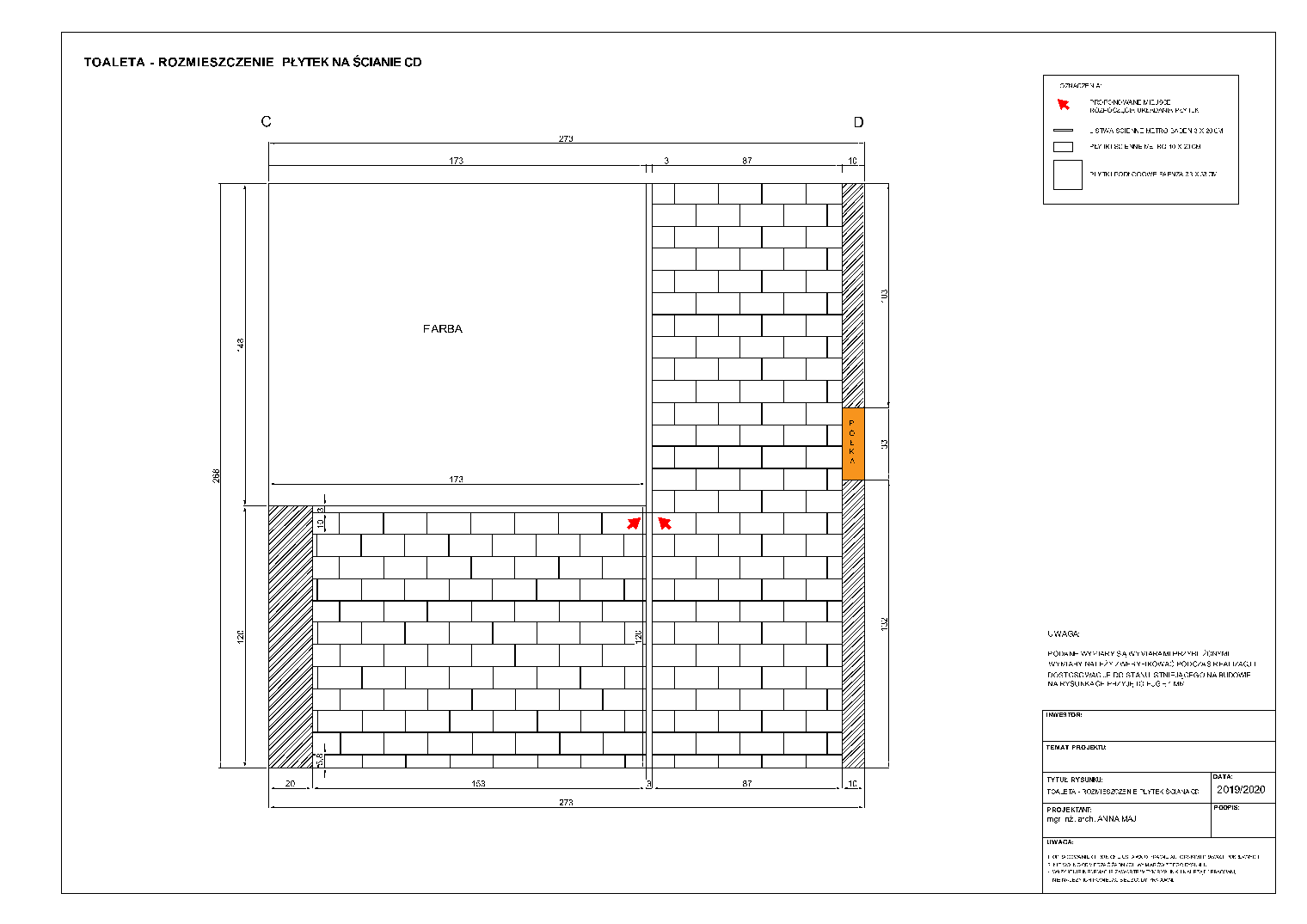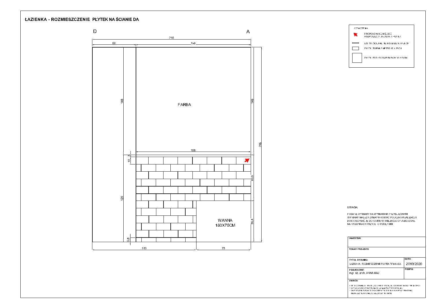 Toaleta jest bardzo wąska i długa. Inwestorom zależało na umieszczeniu prysznica (w łazience obok miała znaleźć się wanna). Prysznic wyeksponowano hiszpańskimi biało-granatowymi płytkami, do połowy ścian wyłożono białe ceramiczne cegiełki, górna część została pomalowana na granatowo odpowiednią farbą do łazienek. Dodatkowo zostały dobrane czarne dodatki takie jak baterie, rama kabiny prysznicowej czy grzejnik. Drewniane półki wprowadzają trochę ciepła i naturalności.