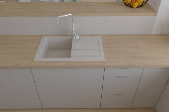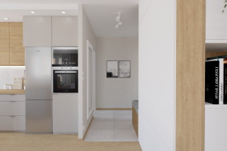 W projekcie od dewelopera kuchnia była przewidziana na jednej ścianie (w miejscu w którym zaaranżowana została w projekcie wyspa kuchenna) i pełniła bardziej funkcję aneksu kuchennego. Inwestorom zależało na kuchni, która będzie miała więcej szafek oraz blatu roboczego. Powstało kilka opcji kuchni, które Klienci mogli zobaczyć w modelu 3D w programie projektowym i przedstawiając wszystkie plusy i minusy wybrać układ, który najbardziej spełniał ich oczekiwania. Inwestorzy zdecydowali się na układ kuchni z wyspą kuchenną, w zabudowie w słupku piekarnika i mikrofalówki. Kolorystyka beżowa.