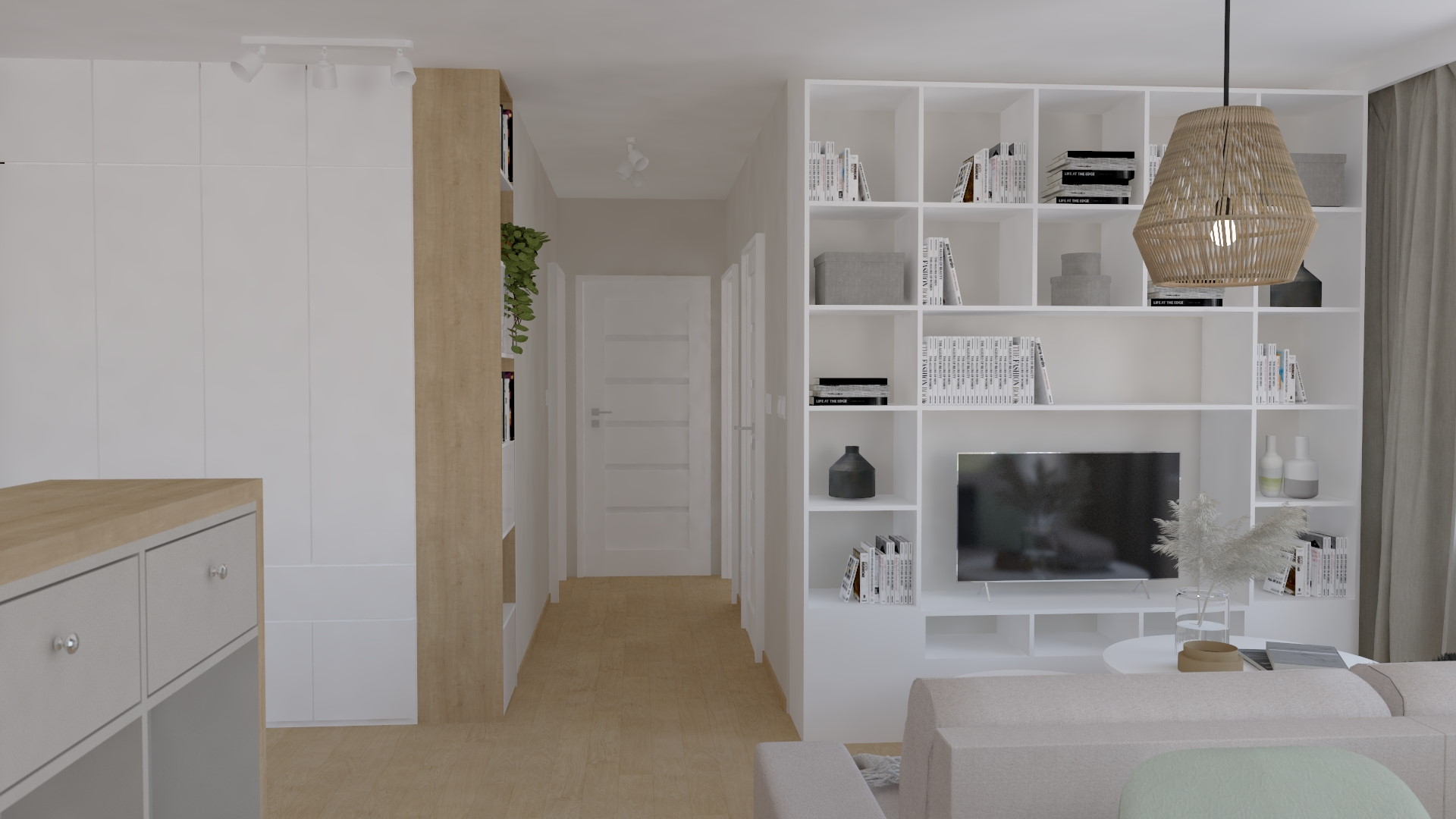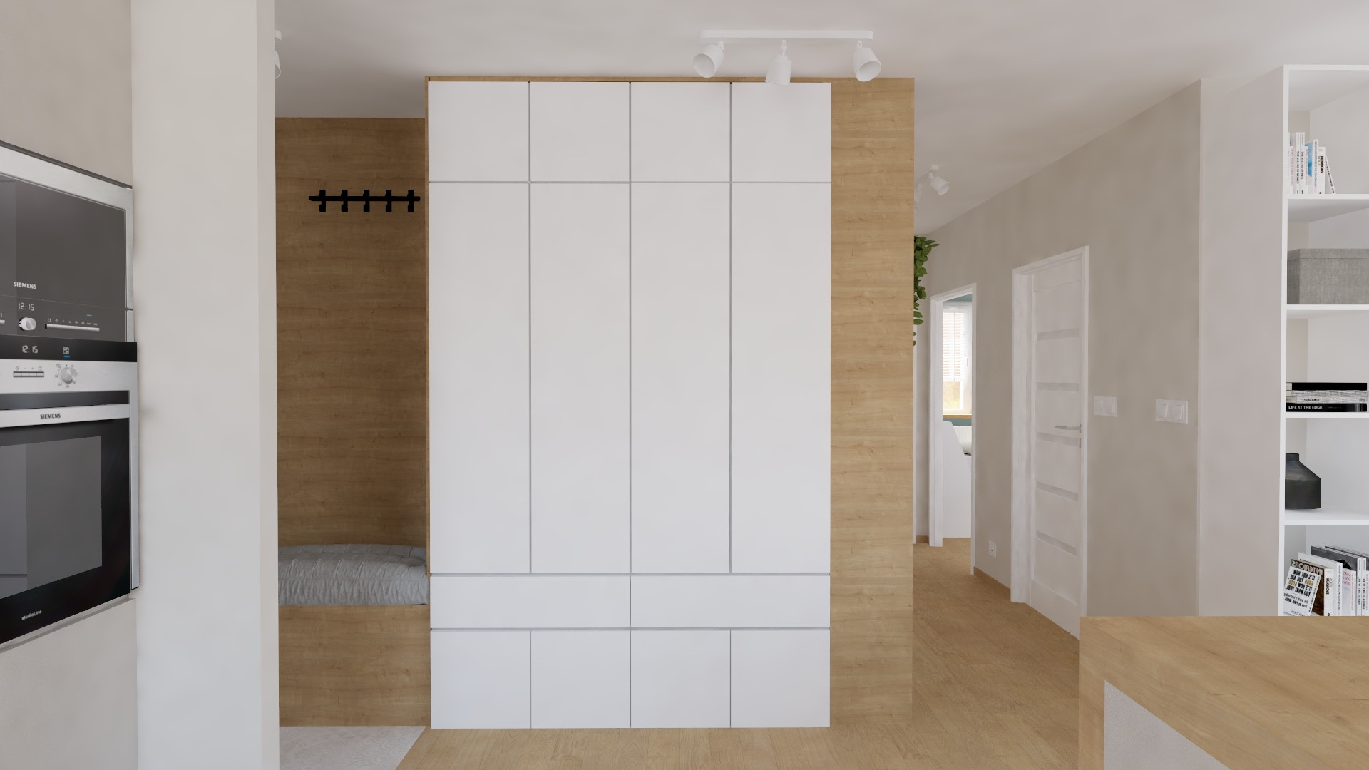 Na początku zmieniliśmy układ funkcjonalny mieszkania, aby wydzielić więcej miejsca na kuchnię. Inwestorzy chcieli zrezygnować z powierzchni gabinetu, poszerzając w ten sposób sypialnię oraz przeznaczając znaczną jej część na kuchnię. Zmieniając układ dwóch ścian zyskaliśmy dodatkowe miejsce pozwalające stworzyć dużą kuchnię z wyspą. Kolejną zmianą było wyburzenie ściany pomiędzy łazienką a toaletą i połączenie tych dwóch pomieszczeń w jedno. Został zmieniony również otwór drzwiowy w pomieszczeniu gospodarczym, tak aby po dwóch stronach można było wstawić szafę, co znacznie powiększyło powierzchnię przechowywania rzeczy.