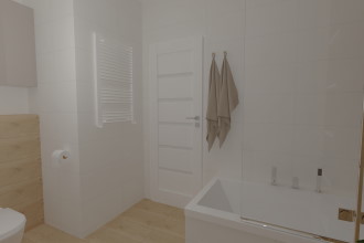 Łazienka powstała przez połączenie dwóch pomieszczeń łazienki i toalety, dzięki czemu powstała większa przestrzeń do zaaranżowania. Aranżacja łazienki łączy w sobie klasyczne białe płytki, z płytkami imitującymi drewno. W pomieszczeniu znajduje się wanna połączona z prysznicem, ukryta pralka oraz suszarka, umywalka z lustrem na tle dekoracyjnej ściany oraz toaleta.