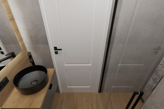 Projekt łazienki jest częścią kompleksowego projektu domu jednorodzinnego w Sosnowcu. Pomieszczenie zostało zaaranżowane z wykorzystaniem wzorzystych płytek w stylu hiszpańskim oraz płytek przypominających swoim wyglądem drewno. W łazience znajduje się prysznic z czarną baterią podtynkową, czarna umywalka oraz toaleta w kolorze grafitowym. Nad umywalką znajduje się lustro z podświetleniem ledowy.