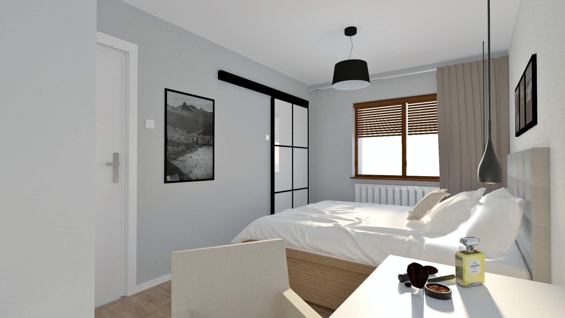 Kolejnym zaprojektowanym pomieszczeniem jest sypialnia, w której znajduje się łóżko z tapicerowanym zagłówkiem, toaletka oraz szafa z regałem robiona pod wymiar. Przy łóżku znajdują się stoliki nocne wraz z czarnymi, wiszącymi lampami. Na ścianie za łóżkiem znajduje się tapeta w delikatny beżowy wzór. Na podłodze znajduje się drewniana podłoga. Drzwi przesuwne w czarnej ramie prowadzą do garderoby.